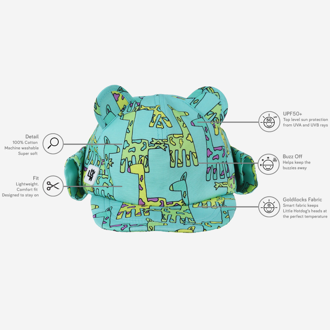 The cub sun hat is designed for all your summer adventures, with a soft brim to shade the face. The cub features hidden neck protection with a roll up flap that can be rolled down on very sunny days. This provides extra protection to little ears and the neck. The Cub sun hat also features two little cute ears on top.