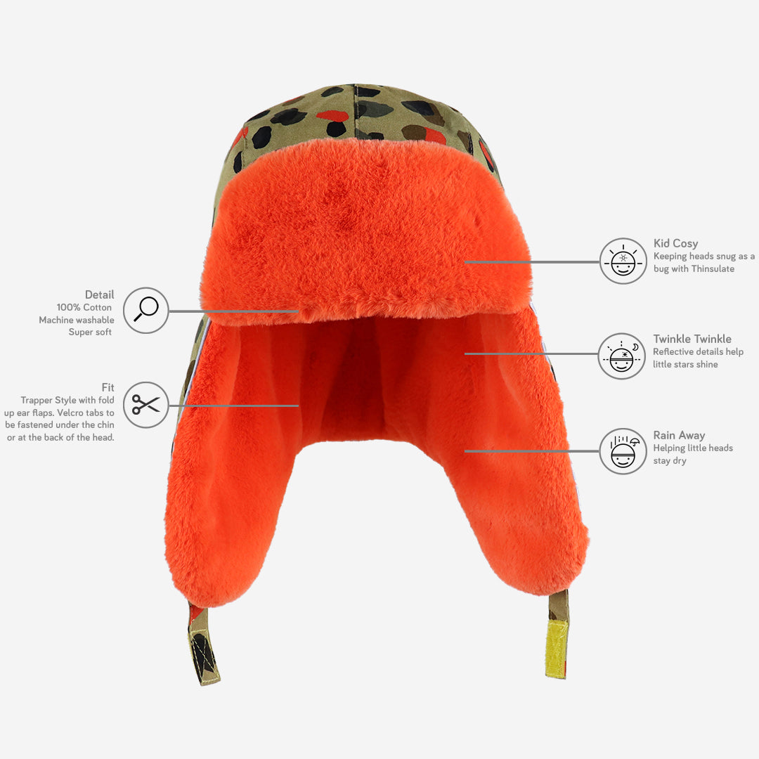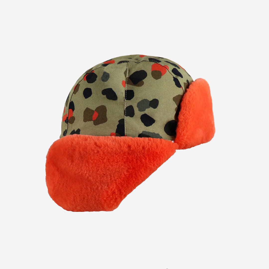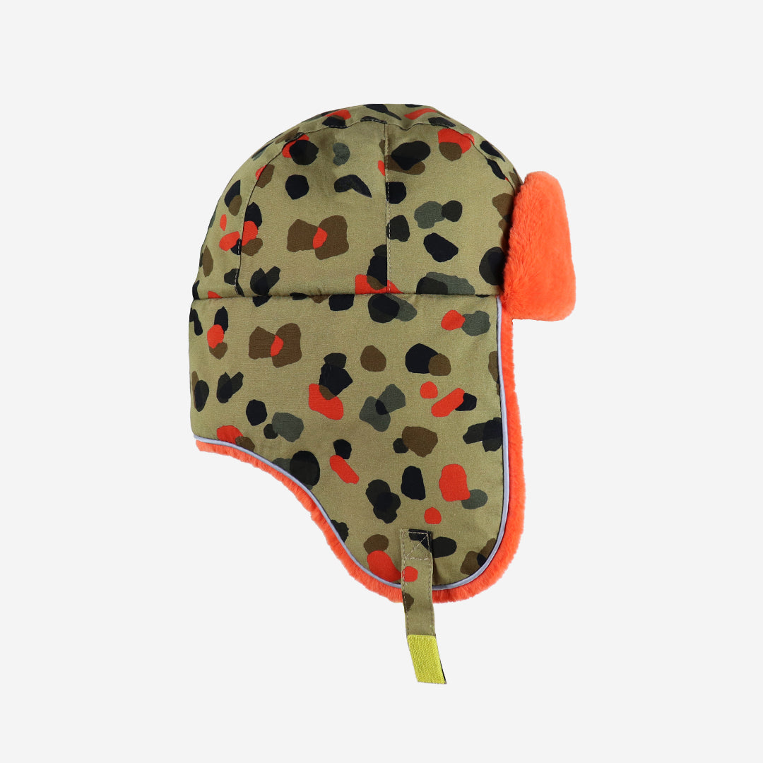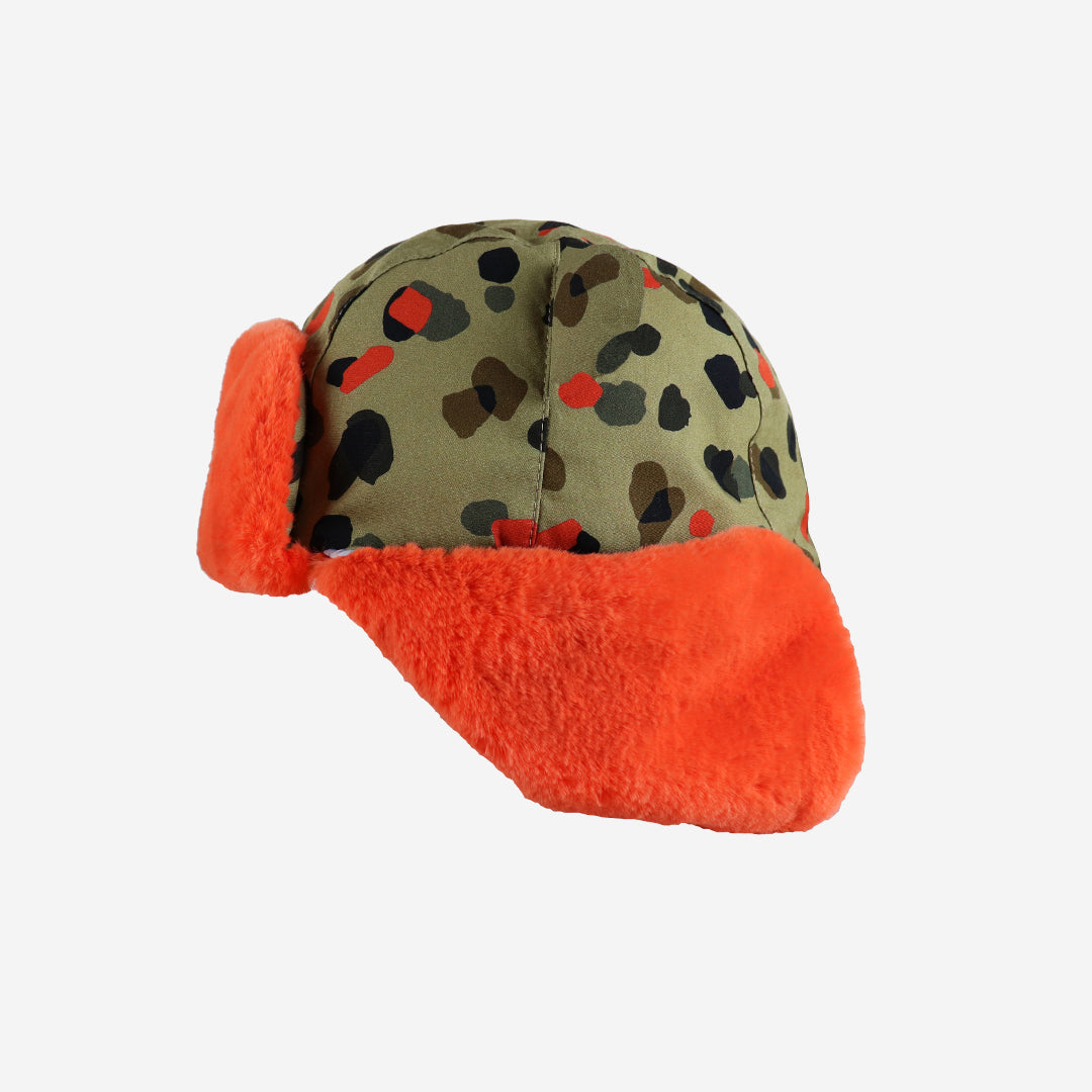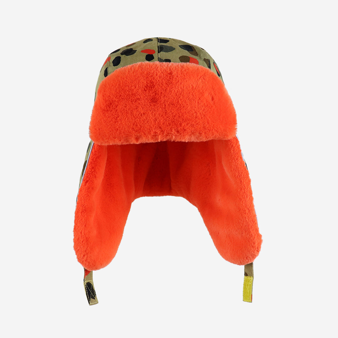 This neutral leopard trapper hat features orange faux fur. It is available in multiple colours and prints to suit your style.