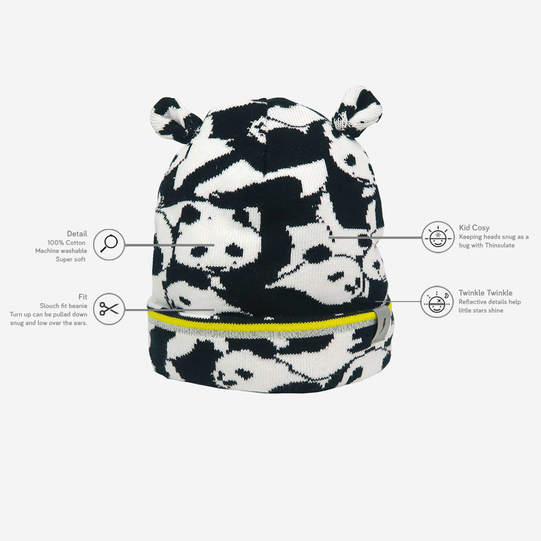 A kid’s knit hat has never ‘bean’ so cool with our slouch-fit Knitted Beanie Rookie with ears in black and white monochrome design. Produced in 100% cotton, you can forget the scratch of a traditional woollen design. Plus, what’s not to love about our funky Panda Pop print in monochrome with vibrant yellow trim.